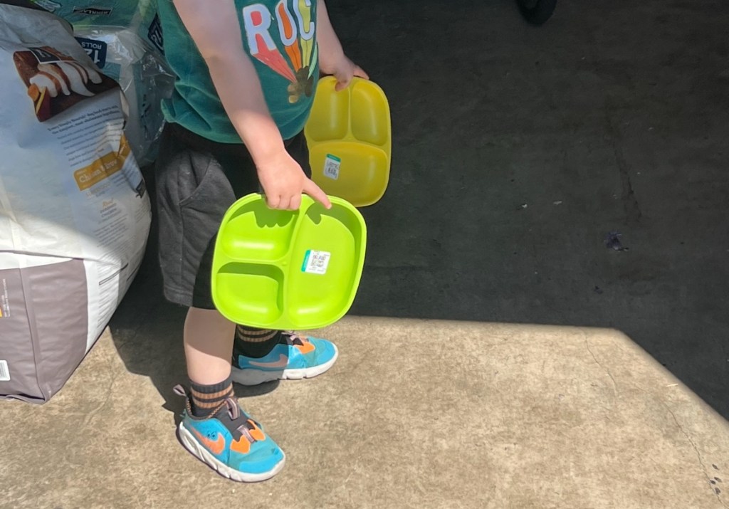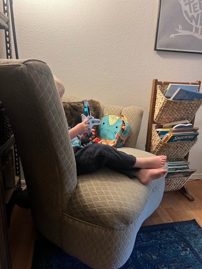 Boo is now sitting in a booster seat at the table with us, eating with these plates I found at Good Will. We weren’t necessarily planning on transitioning from the high chair quite yet, but we’re mostly just vibing through this whole project and we weren’t thinking too much about when we might do it at all. I found a booster seat left out on a curb, though, so it seemed as good a time as any to give it a try. It’s going pretty well, so I think we’ll look for a new home for our high chair. Gradually, the specialized equipment this child needs is decreasing and I love that for us.