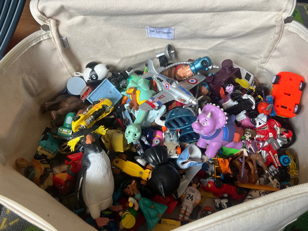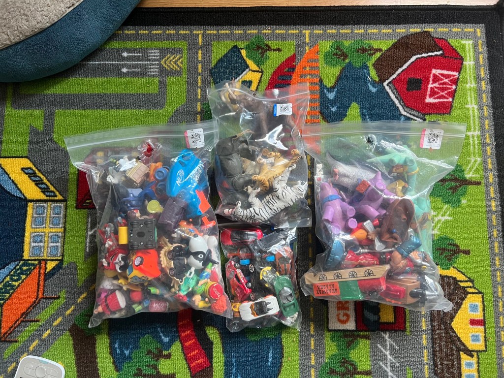 Some of the cars are from my own childhood, toys my mom has brought up for him from the collection she’s kept for grandkids. Most of the toys come from Goodwill’s big aisle of bagged little toys (which I call the stocking stuffer aisle). I’m very happy to extend the life of all these little junks.