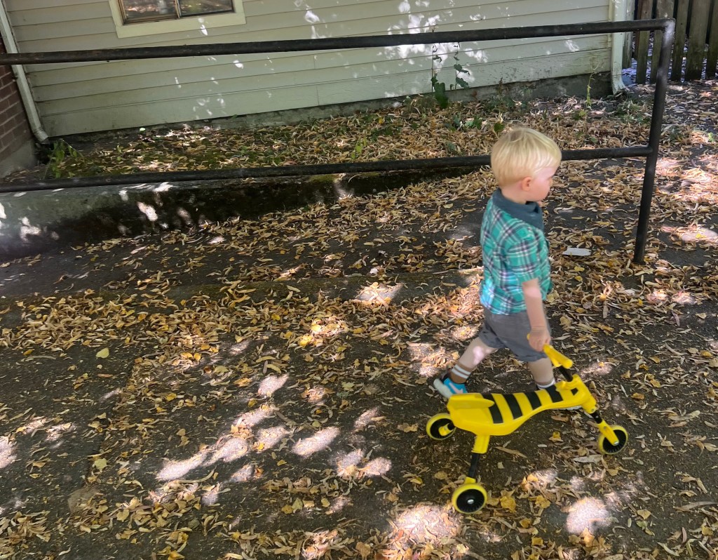 Aside from the biting he’s really pretty great though. We take him to a lot of neighborhood festivals, and there’s been a big shift from early summer to now in terms of how he prefers to spend his time. In early summer he was interested only in sprinting back and forth, or around the block, crashing into one thing after another because he didn’t care about anything but to RUN. We constantly had to pull him away from the street. Currently he isn’t trying to cover as much ground. He still likes to run around with his trike from time to time, but mostly he wants to sit at a table with us and play with his cars. The key has been giving ourselves the flexibility to get up and run around with him for a little while when needed. If we get carried away with the idea that he’s a sitting child now and try to take him to a full sit-down dinner, it still does not go well.