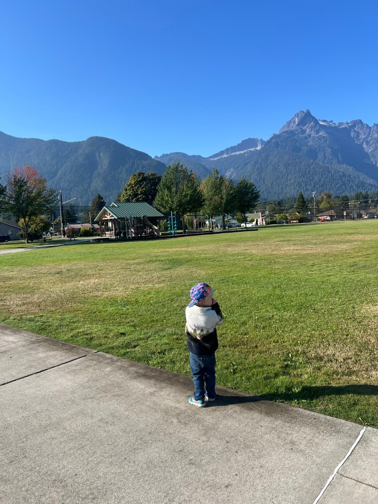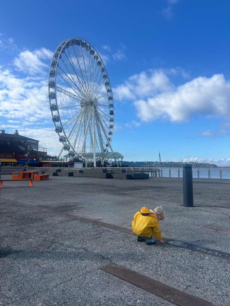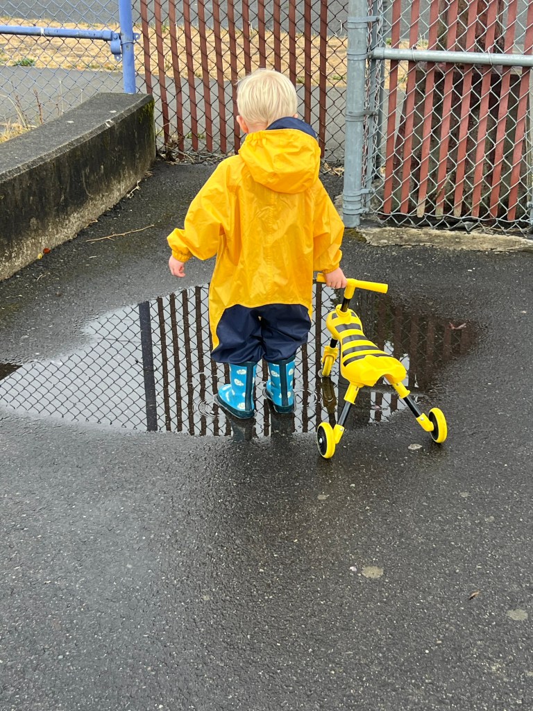 His other favorite book recently has been Little Blue Truck, in which a dump truck gets stuck in a mud puddle and none of the animals care because they don’t like the dump truck. But when their friend Little Blue Truck tries to help push the dump truck and gets stuck himself, the animals all rush over to help. Boo has been acting it out pretty often at home with a toy blue truck and a toy dump truck, along with whatever stuffed animals are within reach. In his version the trucks are helped by a Mariner Moose, a raccoon and a stuffed Alaska Airlines 737. It’s really fun to see him start to pretend.