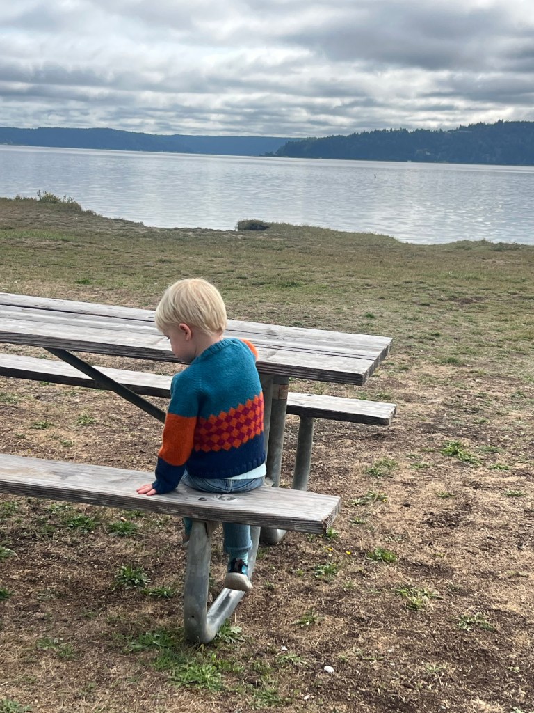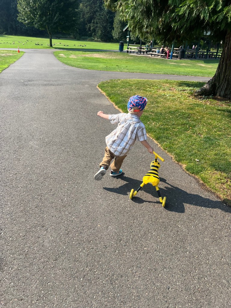 He’s talking a lot more, too. He’s expressing more complex thoughts. He’s making very detailed requests, especially when it comes to what he’s about to eat for lunch. His favorites are still pickled onions and tomatoes. He has turned his back on blackberries, which he still requests but doesn’t eat when they’re given. Fortunate, because the season of finding them every time we walk out our door is nearly over.