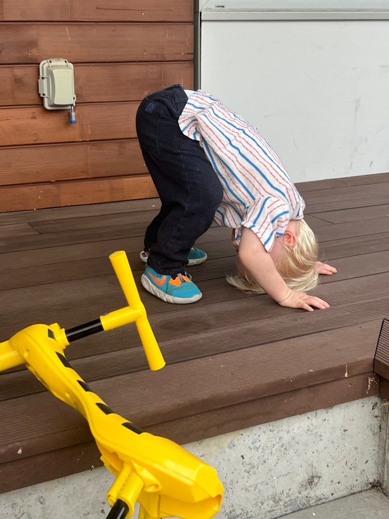 When he falls down, which is often, instead of crying he now frequently crumples up his little face and says “oh my gosh!”