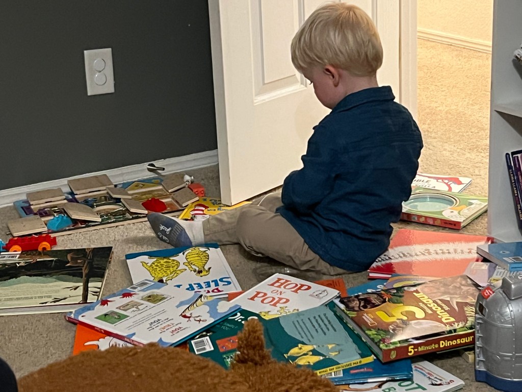 He still wants to read books absolutely all the time at home, which we love. He knows a lot of his books and recites them at random on walks. He has figured out that we can request books from the library, and if something catches his interest – for example, his shadow or a string – he’ll say “get shadow books from the library” or “get string books from the library.” So we do.