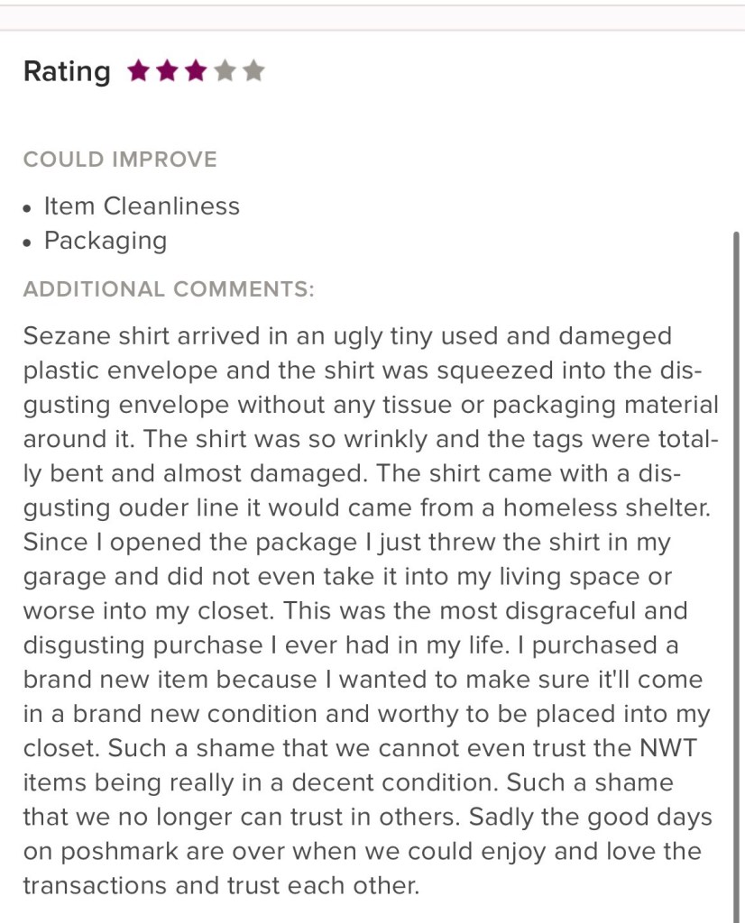 Usually my interactions on these secondhand platforms are very positive, with lovely people enthusiastic about keeping things out of landfill. I save packing materials and reuse them when I sell something, and people often send nice messages about that. Not every interaction is wonderful, though. Occasionally you run into somebody who inexplicably feels entitled to a luxury shopping experience at half the price. After never receiving a negative review before, I recently received the following review after selling somebody a new-with-tags shirt I bought secondhand but didn’t like the fit of: