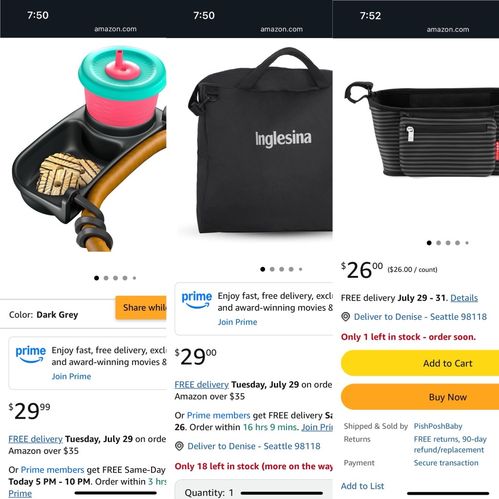 I also bought some accessories for the stroller, all from secondhand resale site Mercari. For those unfamiliar, people sell their used stuff on Mercari, so you’re buying straight from individuals and the item is shipped to you. Because of the shipping it’s a bit less sustainable than buying secondhand locally, but it does allow you to search for somebody selling the exact thing you’re looking for if you don’t see it on a local resale site like OfferUp. At the end of the day, I think it’s a great way to make sure your still-good stuff gets into the hands of somebody who wants to give it more use. I use it all the time to sell and buy. I bought a snack/drink tray that wraps around the handlebar (retails for $29.99) for 18.62 including shipping. I bought the stroller’s travel bag (retails for $29) for $18.58 including shipping. And I bought a caddy that hangs off the back handlebar (retails for $26) for $14 including shipping.