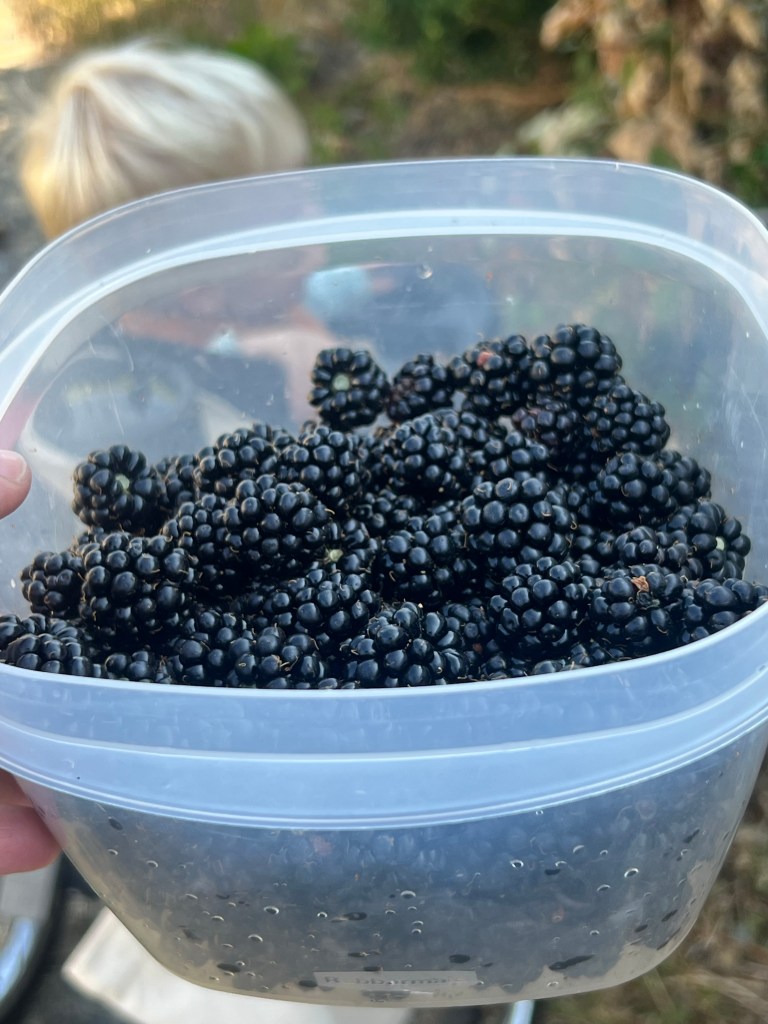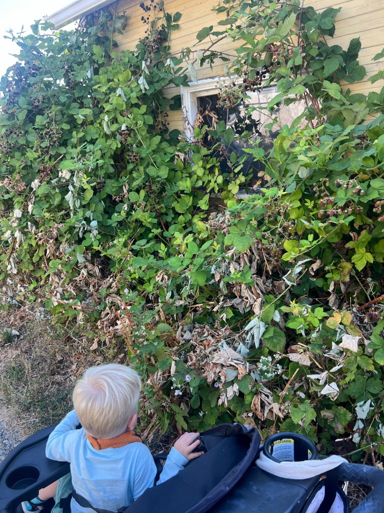 His favorite foods right now are tomatoes, pickled onion, salmon and hummus. And now blackberries. Now that it’s peak blackberry season and we can – and do! – pick blackberries growing alongside any old abandoned shed somebody’s been stabbed in, he’s getting the idea that blackberries just exist out in the world, that we can simply go outside and find blackberries. This is going to be a problem for us in a few weeks. He goes to bed and I hear him in his crib saying “blackberries, blackberries, blackberries.”